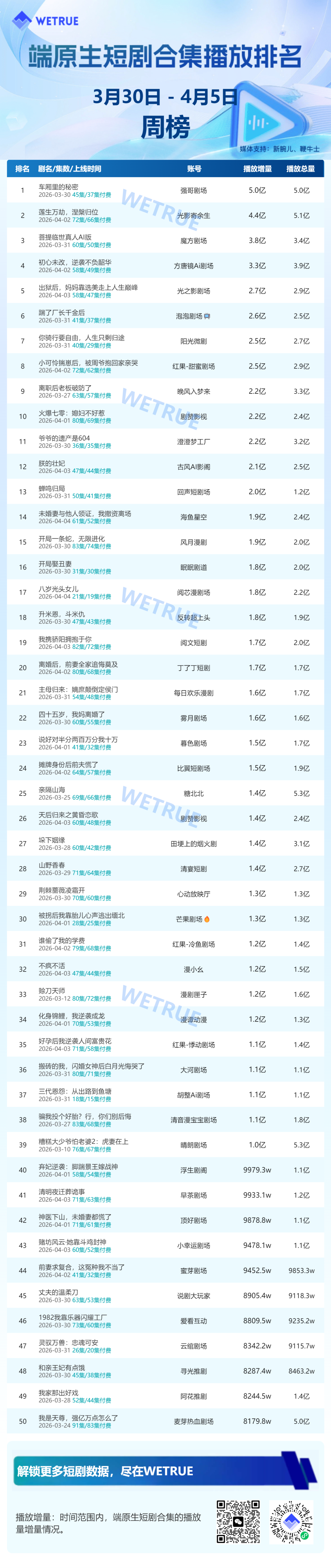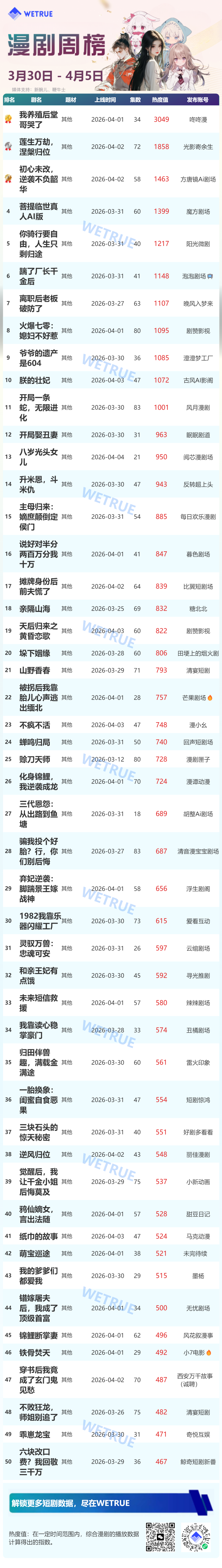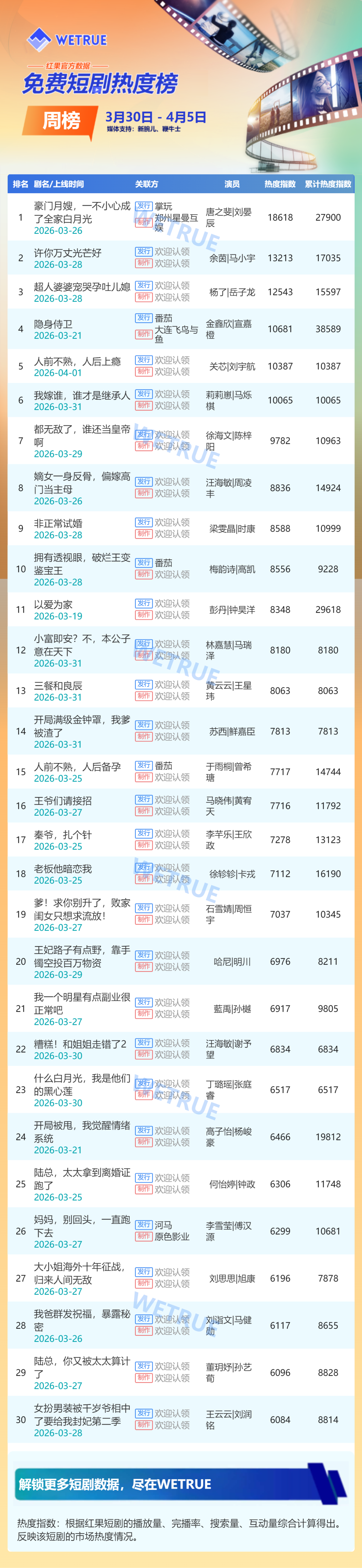 4月7日音信,新腕儿、鞭牛士聚拢WETRUE数据共同推出4月第1周的真东谈主短剧(付费、免费和端原生)&漫剧周榜、免费漫剧热度榜。