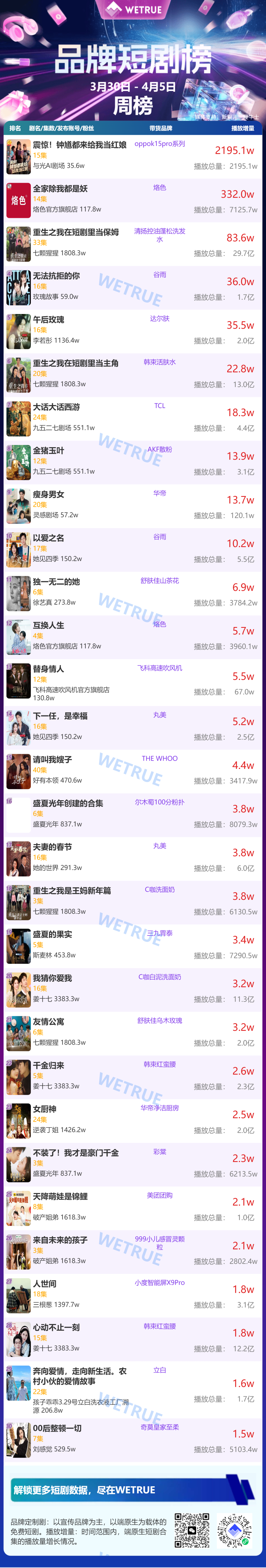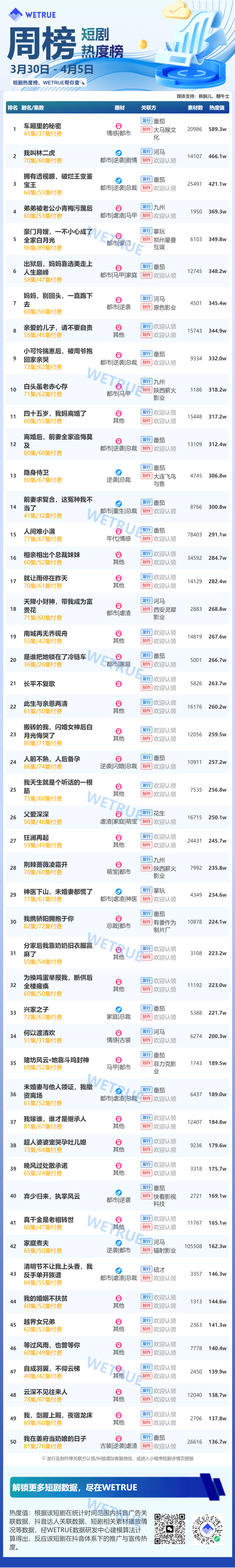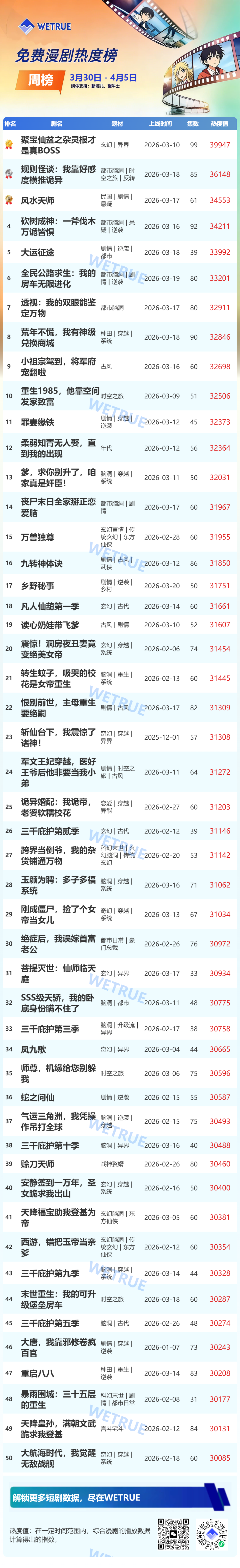 4月7日音信,新腕儿、鞭牛士聚拢WETRUE数据共同推出4月第1周的真东谈主短剧(付费、免费和端原生)&漫剧周榜、免费漫剧热度榜。