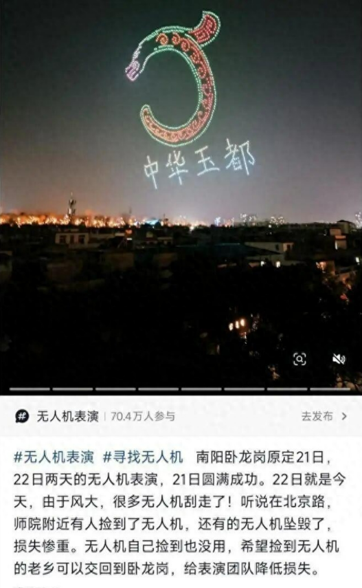 2月22日晚,河南南阳一景区无东谈主机扮演突遇阵风,部分无东谈主机被吹散、掉落,激发网友关注。