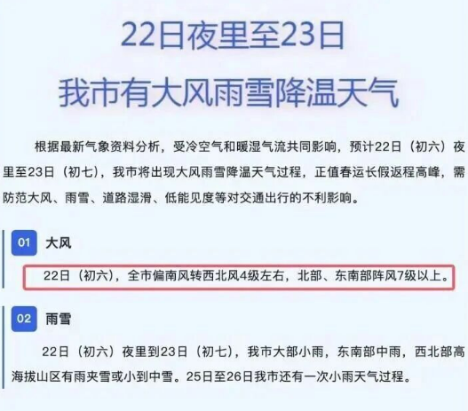据南阳市景色部门22日白昼发布的天气信息,受冷空气和暖潮湿流共同影响,瞻望22日(初六)夜里至23日(初七),该市将出现大风雨雪降温天气历程。22日(初六),全市偏南风转西北风4级傍边,北部、东南部阵风7级以上。
