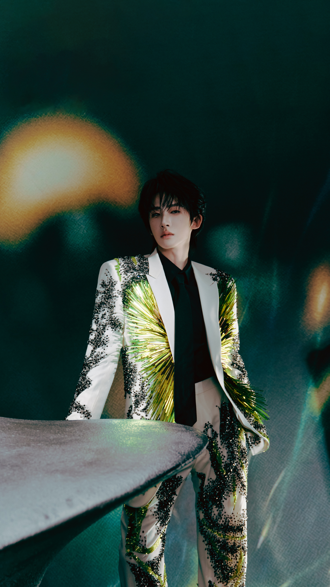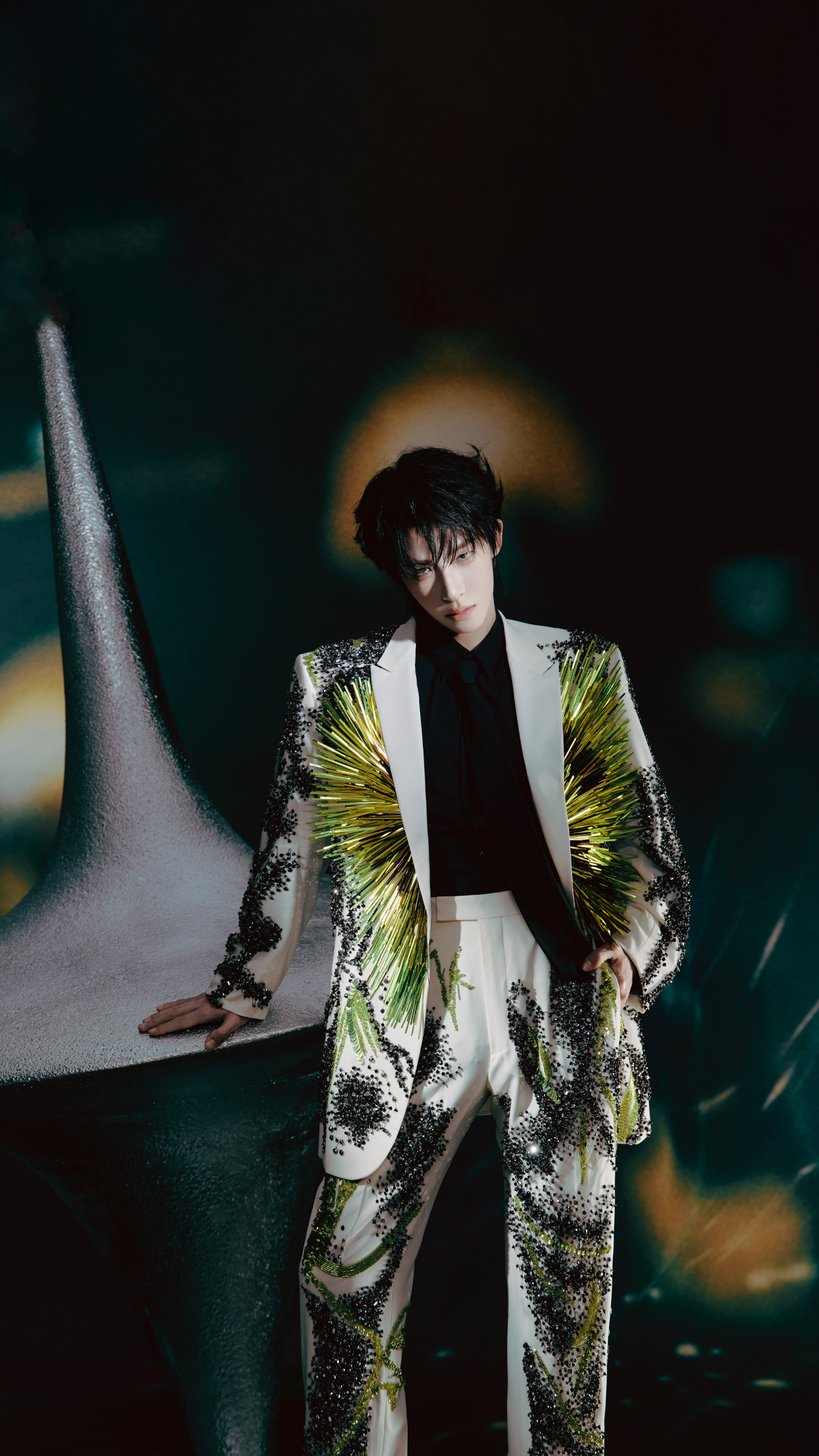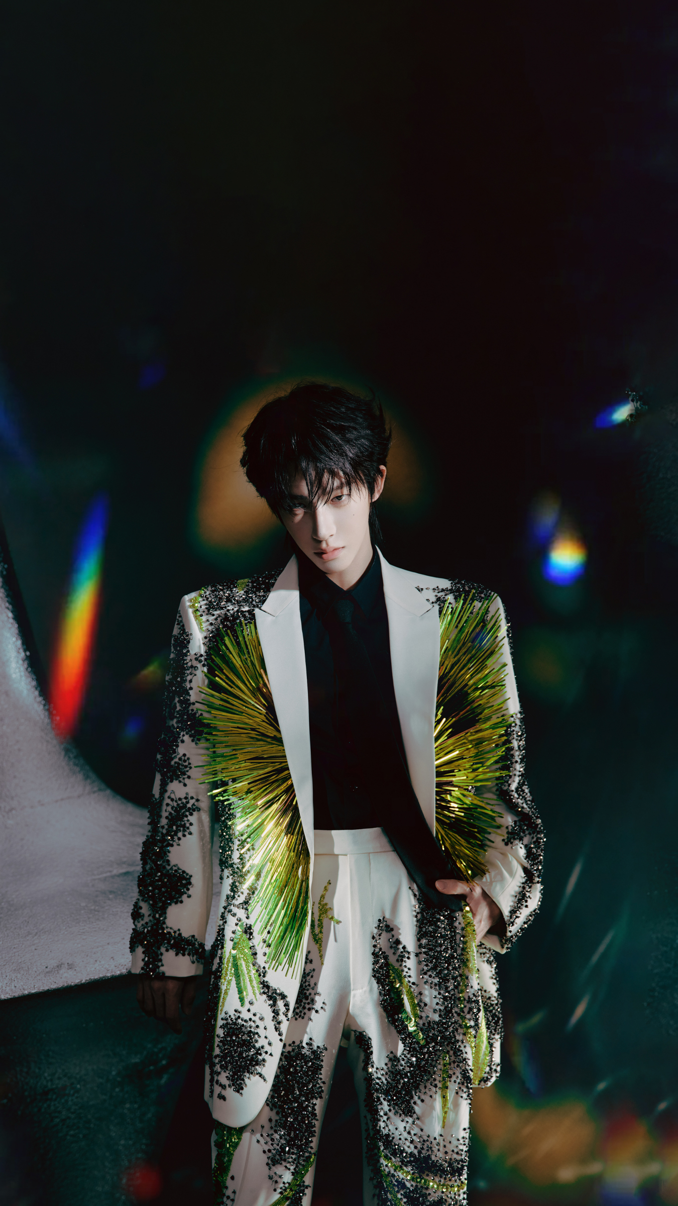 当舞台灯光像开了好意思颜滤镜雷同,穿透那层好意思妙又带点仙气的暗绿色雾霭,刘宇缓缓走出来的那一刻——全场呼吸暂停三秒!他穿的可不是平淡西装,而是一套仿佛从将来丛林里长出来的“星藤战袍”:西装上缀满精明如星辰的亮片,藤蔓般的纹路缠绕其间,既像刚从科幻电影片场踱步出来,又像是从《山海经》里借了点东方灵气。这哪是走秀?分明是行走的艺术安装!