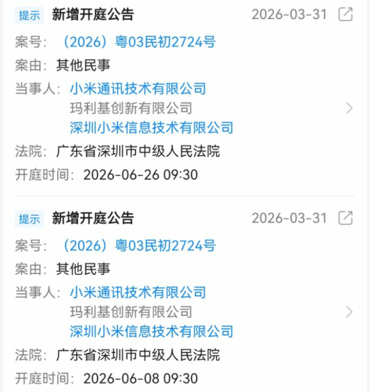 与此同期,中国深圳市中级东说念主民法院公开了两家公司之间的一场诉讼,开云体育app该信息公布于2026年3月31日。然则该信息并未分手原告与被告,以及案由。然则从不了这起案件,案号(2026)粤03民初2724案将于6月8日和6月26日分别进行两场开庭。