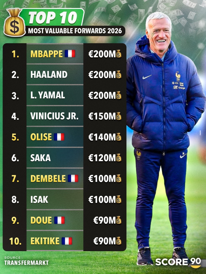 足坛身价名次前十的先锋有2亿欧元的姆巴佩、哈兰德、亚马尔;1.5亿欧元的维尼修斯;1.4亿欧元的奥利塞;1.2亿欧元的萨卡;1亿欧元的登贝莱和伊萨克,9000万欧元的杜埃和埃基蒂克。