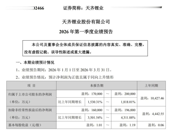 4月20日,A股锂矿龙头企业天都锂业(002466.SZ)公告称,瞻望2026年第一季度包摄于上市公司鼓舞的净利润为17亿元—20亿元,比上年同时增长1530.31%—1818.01%。