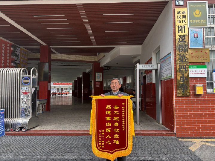 2026年3月4日上昼,新洲区双柳街沙咀村村民代表,一溜6东说念主在村支部雷文告的带领下,专程来到新洲区阳逻街第四小学,将一面绣有“肝脑涂地救危难 品德高尚暖东说念主心”的锦旗送到了郑志兵淳厚手中,锦旗上的鎏金大字熠熠生辉,承载着全村东说念主对郑淳厚勇救落水村民的深深谢意与崇高敬意,也让这个春日的校园暖意融融。