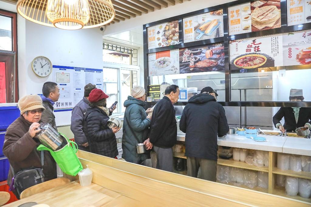 老东说念主列队在老年食堂打饭。董芳忠摄
